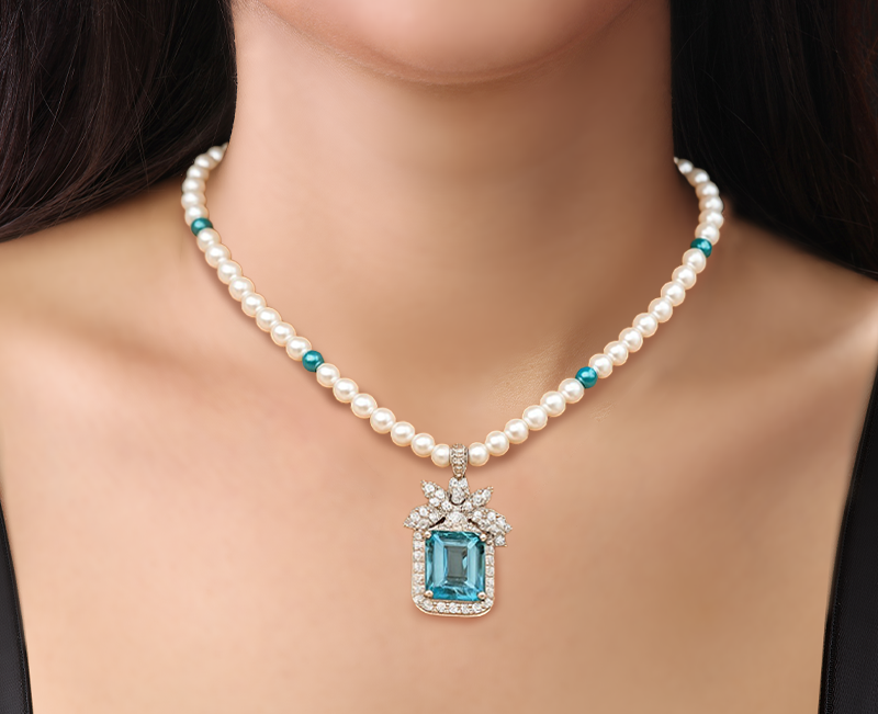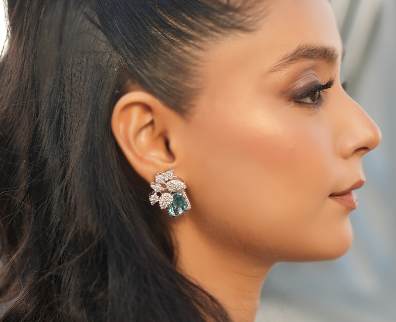 A striking turquoise cubic zirconia forms the centerpiece, shaped like a pineapple and surrounded by clear zirconia stones arranged in a leaf-like pattern. The bold teal stone evokes the richness of an emerald, while the intricate design adds a floral, sparkling touch.