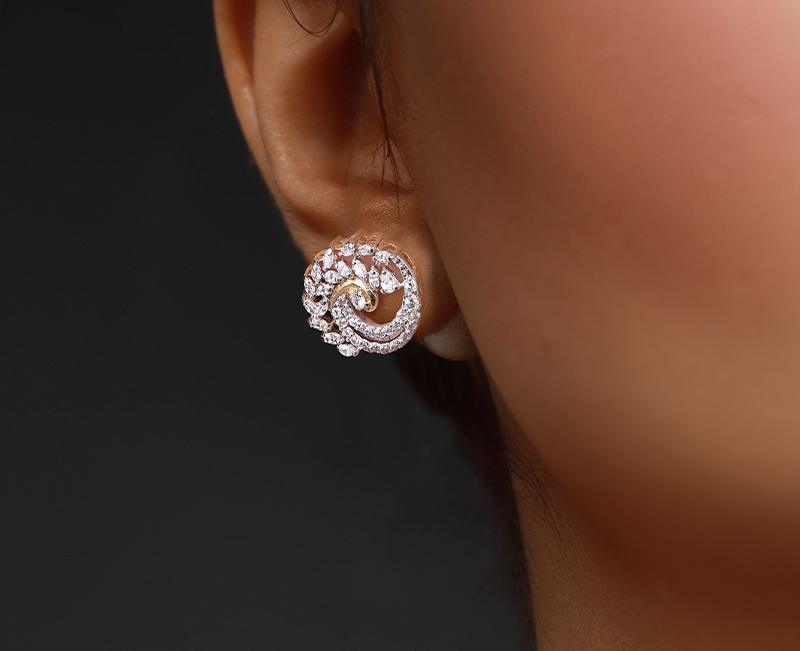 The whirlwind earring features a spiral design of gold and silver tones. A gold swirl at the center is adorned with clear marquise and round gemstones forming a floral pattern. The silver outer edge is set with small, clear zirconia stones for added sparkle.