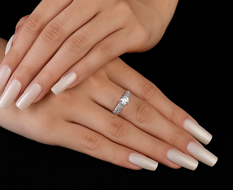 This ring showcases a round brilliant-cut center stone in a classic prong setting, elevated by a wide band encrusted with rows of smaller clear stones. The pavé-style detailing adds an extra layer of sparkle, making it a bold yet classic statement piece.